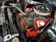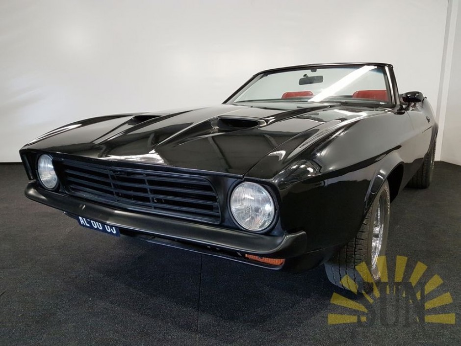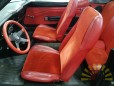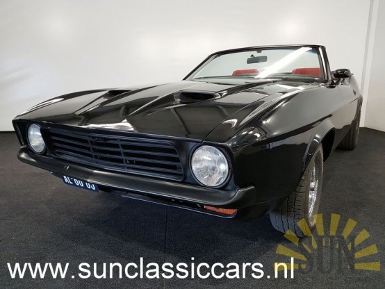This is a 1972 Ford Mustang. The car has the wonderful colour combination of black paint with a red interior. The powerful V8 5.7 L engine turns well. The electric cabriotop functions the way it should.