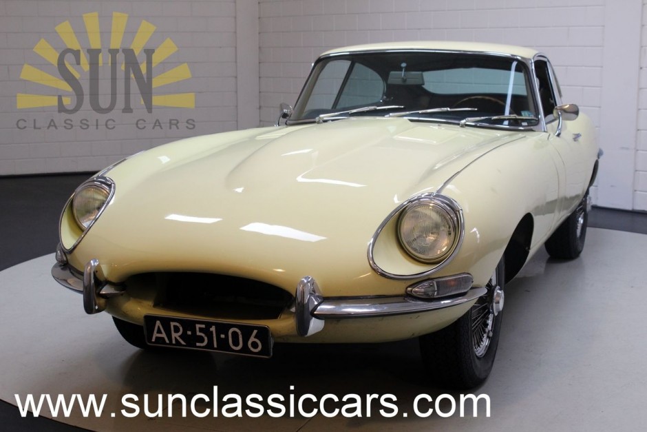 This is a 1968 Jaguar E-type S1 coupe. This rare coupe version is equipped with a 6 cylinder 4200cc engine and a manual gearbox. The Jaguar has Prime Rose Yellow paint and a black leather interior. The Jaguar E-type comes with a Dutch license plate and a valid MOT inspection.