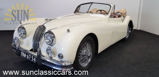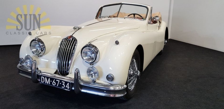 This is a 1956 Jaguar XK140 DHC, matching numbers. The Jaguar has Ivory White paint and a tan leather interior. The Jaguar is suited for touring or rally’s. The car is in drivers condition. The XK 140 has been given a conversion of drum brakes to disc brakes for better performances. The XK 140 has Holland title.