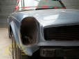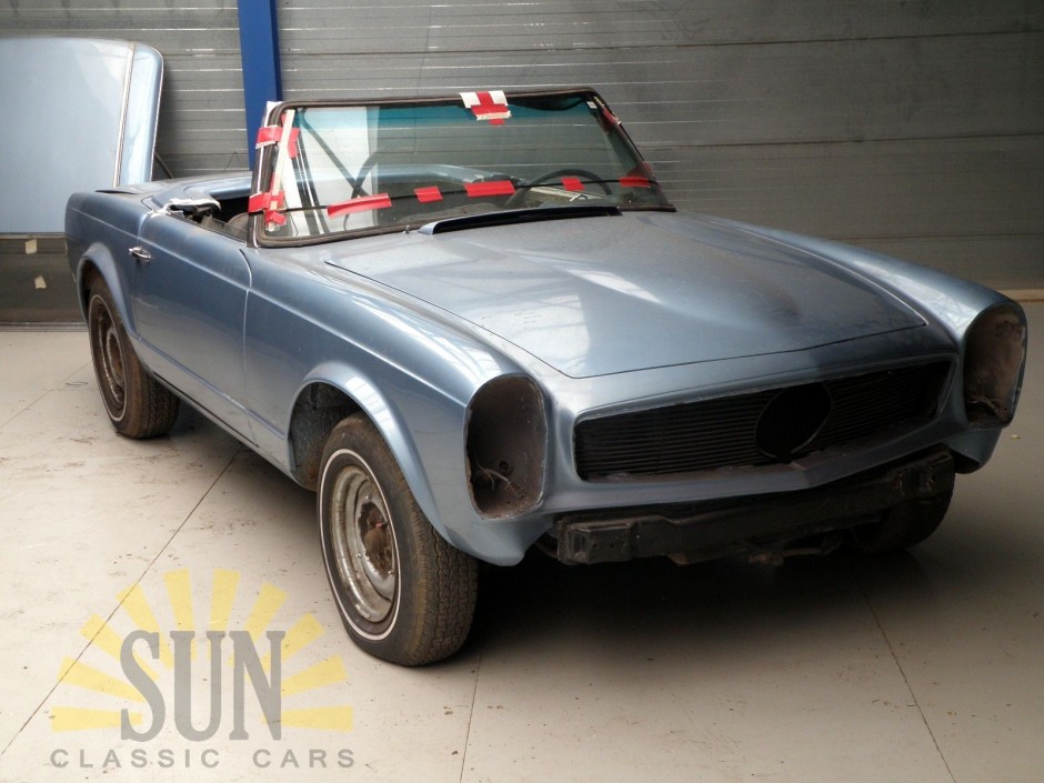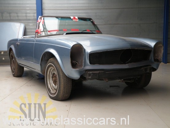 The production of the Mercedes-Benz 230SL started in June 1963 and ended on 5 January 1967. The ‘dual-circuit’ brake system had disc brakes at the front and power-assisted drum brakes at the back. This is a 1965 Mercedes-Benz 230SL. He is partly restored but restoration needs to be finished, the car needs welding. The car has paint in colour blue which makes it a perfect match with the dark blue interior. The engine of the car turns by hand. The car has the original tachometer. This 230SL has an original 6 in line engine with 2306CC and 170 HP. The car has American title and importdocuments are present.